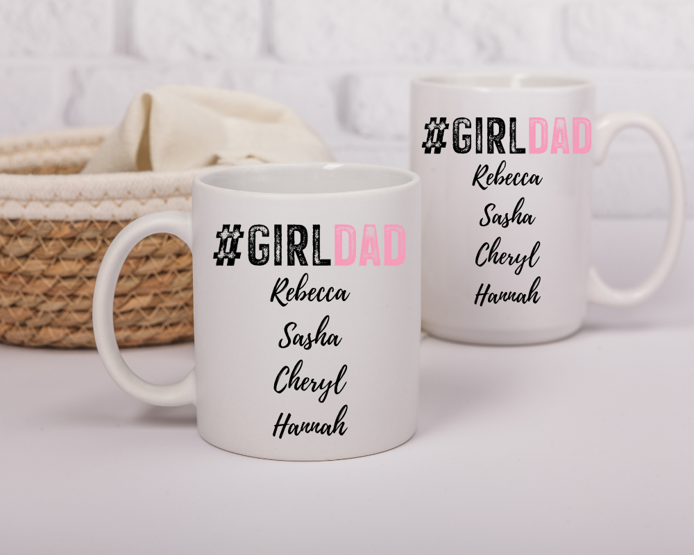 Celebrate the special bond with your daughters with this "#GIRLDAD" personalized mug! Featuring a trendy hashtag design in pink and space to showcase the names of your beloved girls in a stylish script font. This mug makes a wonderful Father's Day, birthday, or just-because gift for any proud girl dad. Enjoy your favorite drink while cherishing your family.