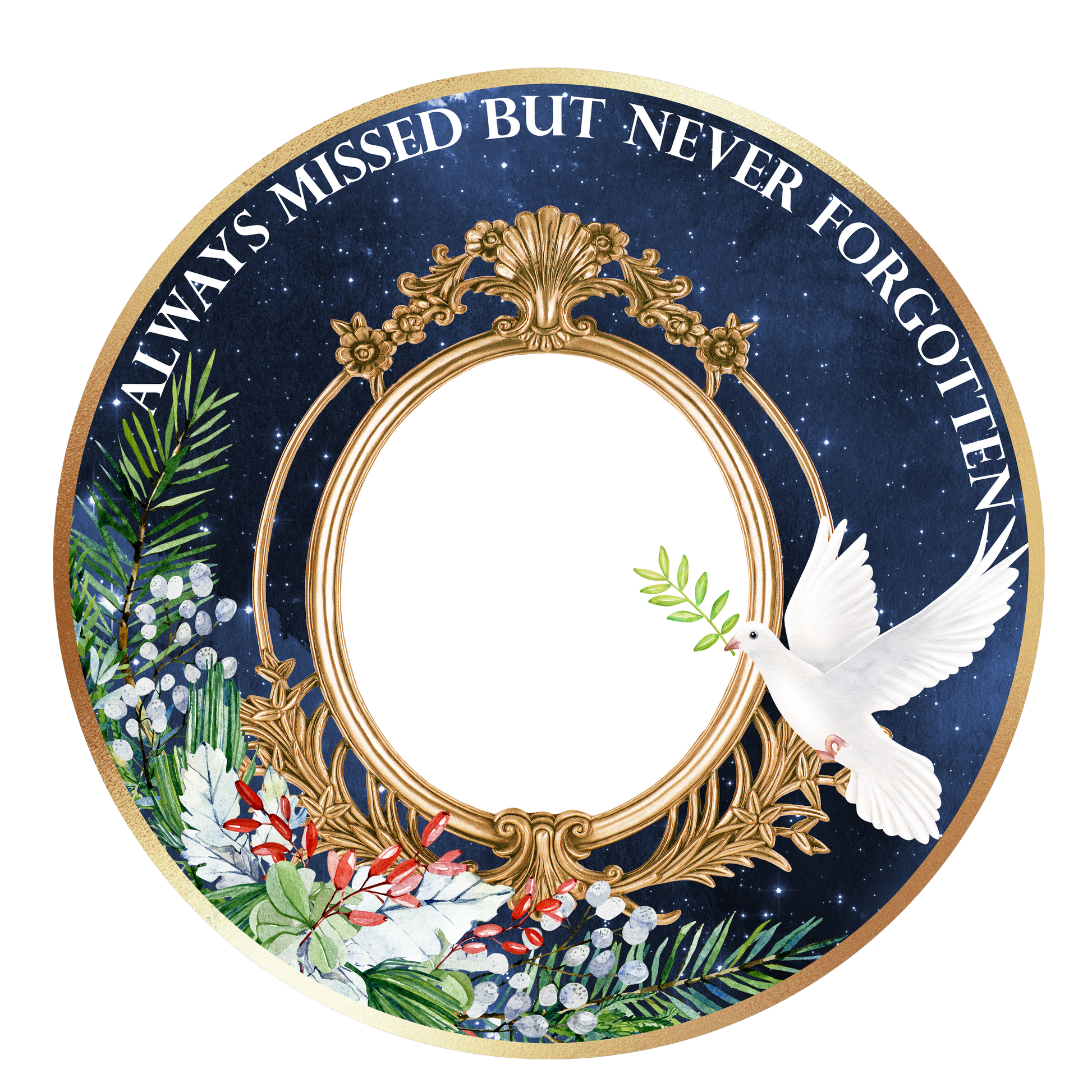 Honor the memory of your loved ones with our Always Missed But Never Forgotten Memorial Ornament — a heartfelt keepsake designed to celebrate those who hold a special place in your heart. This elegant round ornament features a delicate photo frame surrounded by soft florals and a peaceful white dove — symbolizing love, peace, and remembrance. Available in two timeless finishes — Gold for a classic, luxurious glow, or Blue for a serene, comforting touch. Each ornament can be personalized with your favorite photo, making it a cherished addition to your holiday tree or a thoughtful sympathy gift.